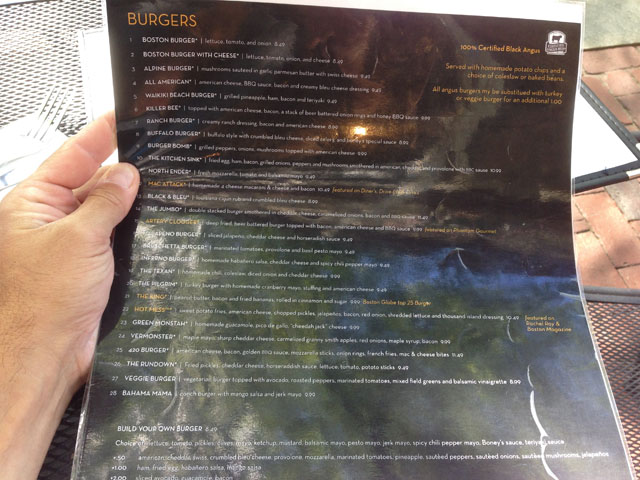 C’est le temple du BURGER à Boston, le vidéo ci-dessus vous mettra tout-de-suite dans l’ambiance. Boston Burger Company est célèbre à Boston. Ses victoires aux différentes « Burger contest » y sont pour quelque chose, comme le passage de Guy Fieri, célèbre pour son émission culinaire sur Foodnetwork « Diners, Drives-ins and dives« . Je vous laisse aller faire un tour sur leur site Internet pour visionner les nombreuses vidéos.