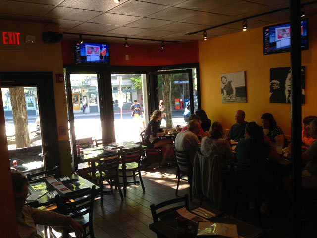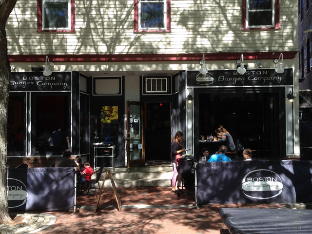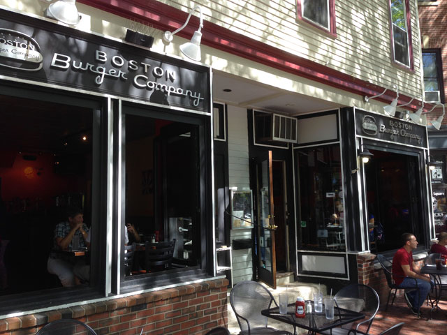 Je me baladais à Somerville (quartier fort sympathique au nord-est de Boston) sans ambition aucune. A la sortie du « T » (redline, Davis Square) je découvre une jolie petite place ombragée à Davis Square. Les pavés en brique rouge dominent. Plusieurs tables sont installés pour les badauds. Beaucoup de mondes sont-là pour discuter et profiter du soleil. En marchant sur cette place, mon regard est tout de suite attiré par une enseigne au nom révélateur « Boston Burger Company ». Un restaurant « simple » avec deux jolies salles à manger. Ce lieu ressemble à une sympathique bistrot sans prétention. Rouge et noir, la décoration est simple. Il doit y avoir une dizaines de tables à l’intérieur et quatre tables à l’extérieur.