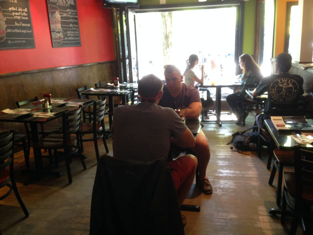 Pour l’anecdote, ne connaissant pas le lieu, mon voisin de table commande un Killer Be (topped with american cheese, bacon, a stack of beer battered onion rings and honey BBQ sauce). Lorsque la serveuse lui apporte son assiette, je ne peux que éclater de rire tellement son burger est immense ! 4 Oignons rings sont posées sur la viande et le burger mesure 20cm de haut avec de la barbecue sauce qui dégouline de tous les côtés. C’était juste incroyable ! Je suis bouche-bée, sans voix… mon voisin a tenté de l’écraser et le mettre dans sa bouche mais IMPOSSIBLE ! Il ne finira pas son assiette d’ailleurs. Petit joueur…